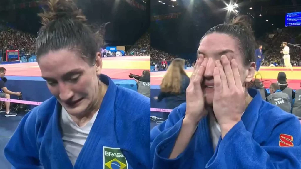 Para quem está por fora: a atleta brasileira perdeu a disputa individual de Judô em uma luta contra a italiana Alice Bellandi. Com isso, ela está eliminada e não tem mais chances de concorrer à medalha das Olimpíadas de Paris.