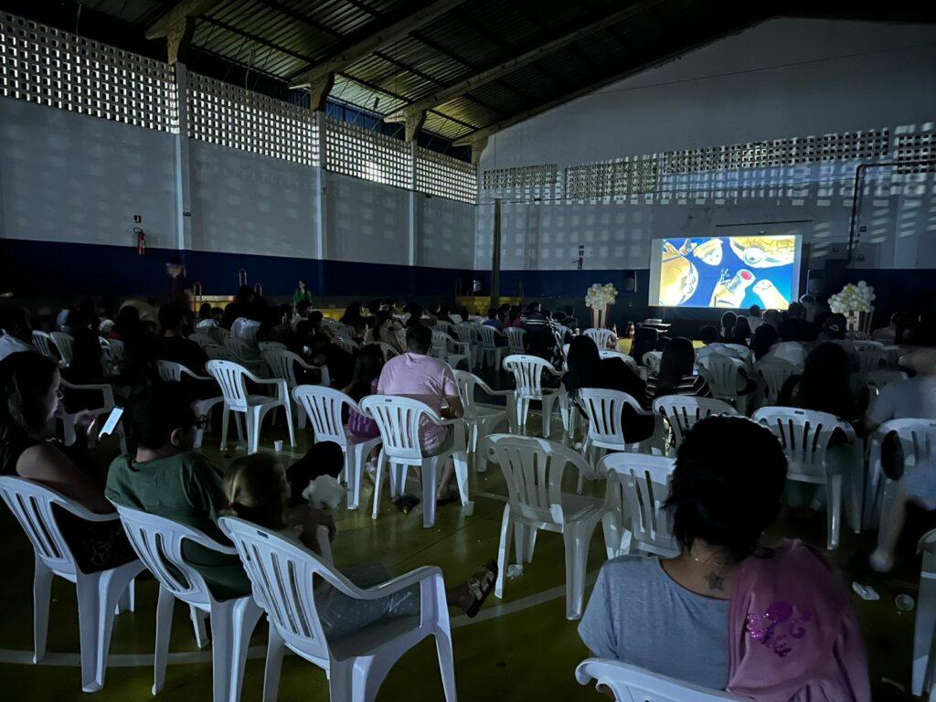 O evento aconteceu no Ginásio Municipal, em um espaço preparado para receber famílias, jovens e crianças, oferecendo a todos uma experiência cinematográfica única. O filme escolhido para essa celebração foi “Meu Malvado Favorito 4”, uma animação divertida e repleta de aventuras, que encantou tanto os pequenos quanto os adultos presentes.