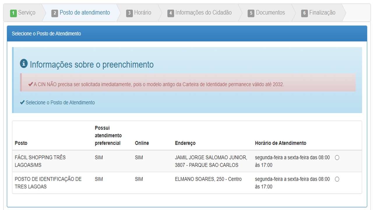Na sequência escolha o local onde deseja ser atendido. Em Três Lagoas tem duas opções.