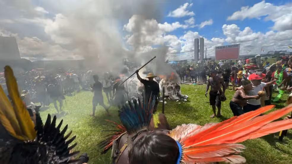 Indígenas incendiaram objetos na área central de Brasília (Foto: Reprodução/TV Globo)
