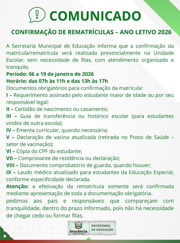 A Secretaria Municipal de Educação informa que a confirmação da matrícula e rematrícula para o ano letivo de 2026 será realizada presencialmente nas Unidades Escolares, no período de 06 a 19 de janeiro de 2026. O atendimento ocorrerá de forma organizada, tranquila e sem necessidade de formação de filas, nos seguintes horários: 🕖 das 07h às 11h e 🕐 das 13h às 17h. […]